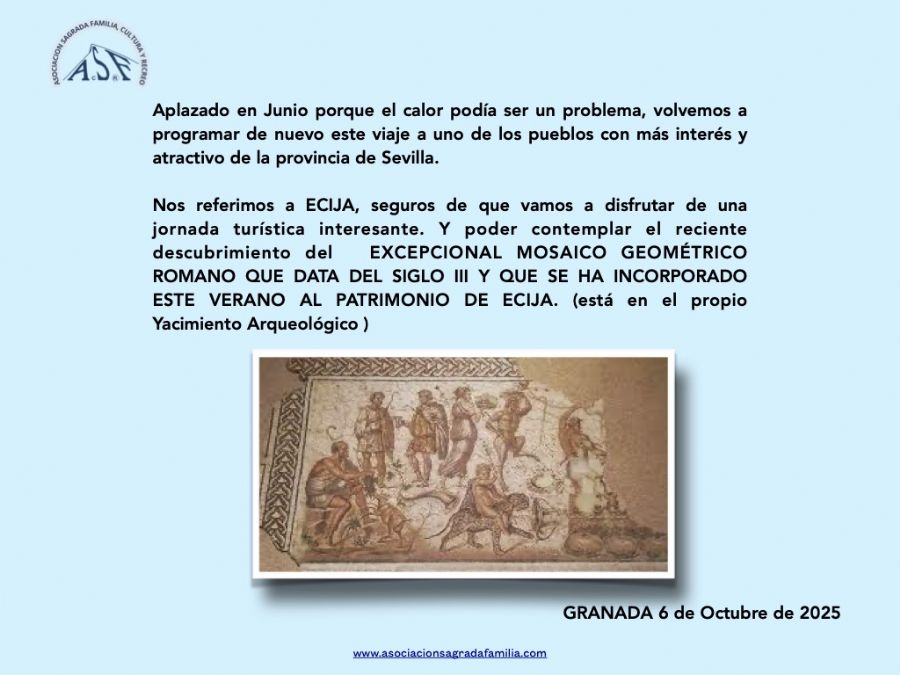 Nos referimos a ECIJA, seguros de que vamos a disfrutar de una jornada turística interesante. Y poder contemplar el reciente descubrimiento del EXCEPCIONAL MOSAICO GEOMÉTRICO ROMANO QUE DATA DEL SIGLO III Y QUE SE HA INCORPORADO ESTE VERANO AL PATRIMONIO DE ECIJA. (está en el propio Yacimiento Arqueológico )