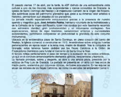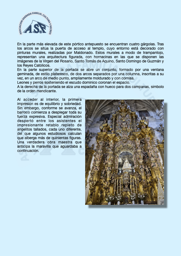 El pasado viernes 17 de abril, por la tarde, la ASF disfrutó de una extraordinaria visita cultural a uno de los rincones más sorprendentes y menos conocidos de Granada: la Iglesia de Santo Domingo del Realejo y el majestuoso Camarín de la Virgen del Rosario, dos auténticas joyas del patrimonio granadino que, pese a su inmenso valor artístico e histórico, permanecen aún alejadas de los granadinos.