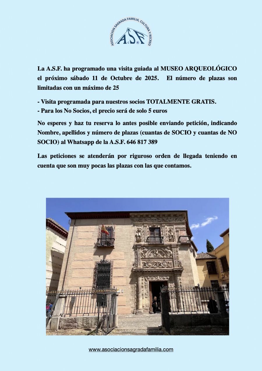¡¡¡PLAZAS AGOTADAS!!! La A.S.F. ha programado una visita guiada al MUSEO ARQUEOLÓGICO el próximo sábado 11 de Octubre de 2025. El número de plazas son limitadas con un máximo de 25 - Visita programada para nuestros socios TOTALMENTE GRATIS. - Para los No Socios, el precio será de solo 5 euros No esperes y haz tu reserva lo antes posible enviando petición, indicando Nombre, apellidos y número de plazas (cuantas...