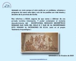 Nos referimos a ECIJA, seguros de que vamos a disfrutar de una jornada turística interesante. Y poder contemplar el reciente descubrimiento del EXCEPCIONAL MOSAICO GEOMÉTRICO ROMANO QUE DATA DEL SIGLO III Y QUE SE HA INCORPORADO ESTE VERANO AL PATRIMONIO DE ECIJA. (está en el propio Yacimiento Arqueológico )