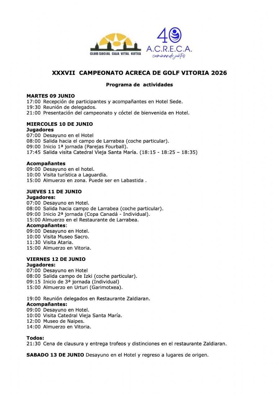 XXXVII CAMPEONATO ACRECA DE GOLF VITORIA 2026 Por la presente se convoca la edición número XXXVII del Campeonato ACRECA de Golf, que se celebrará del 9 al 13 de junio, con sede en la ciudad de Vitoria. Los organizadores, es el Club Social de Caja Vital - Kutxabank. En este año al Federación cumple su 40 Aniversario con el lema Caminando Juntos, casi tantos como se lleva disputando este Campeonato. Os animamos a participar y dar realce a la efem&ea...