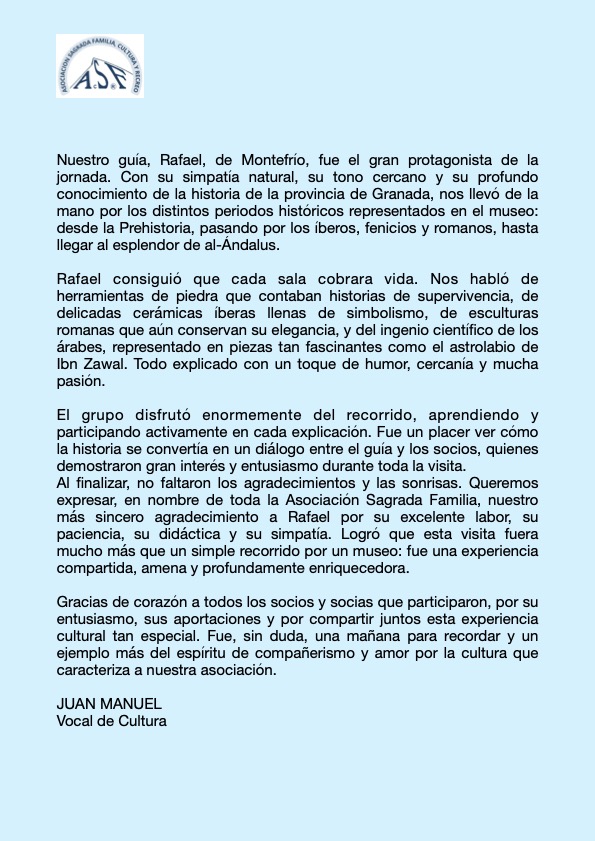 Al finalizar, no faltaron los agradecimientos y las sonrisas. Queremos expresar, en nombre de toda la Asociación Sagrada Familia, nuestro más sincero agradecimiento a Rafael por su excelente labor, su paciencia, su didáctica y su simpatía. Logró que esta visita fuera mucho más que un simple recorrido por un museo: fue una experiencia compartida, amena y profundamente enriquecedora.