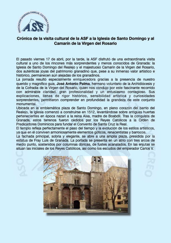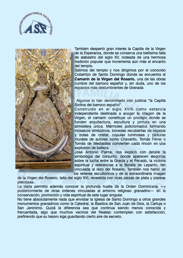 El pasado viernes 17 de abril, por la tarde, la ASF disfrutó de una extraordinaria visita cultural a uno de los rincones más sorprendentes y menos conocidos de Granada: la Iglesia de Santo Domingo del Realejo y el majestuoso Camarín de la Virgen del Rosario, dos auténticas joyas del patrimonio granadino que, pese a su inmenso valor artístico e histórico, permanecen aún alejadas de los granadinos.