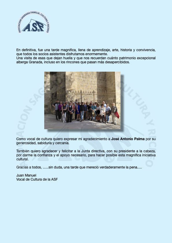 En definitiva, fue una tarde magnífica, llena de aprendizaje, arte, historia y convivencia, que todos los socios asistentes disfrutamos enormemente. Una visita de esas que dejan huella y que nos recuerdan cuánto patrimonio excepcional alberga Granada, incluso en los rincones que pasan más desapercibidos.