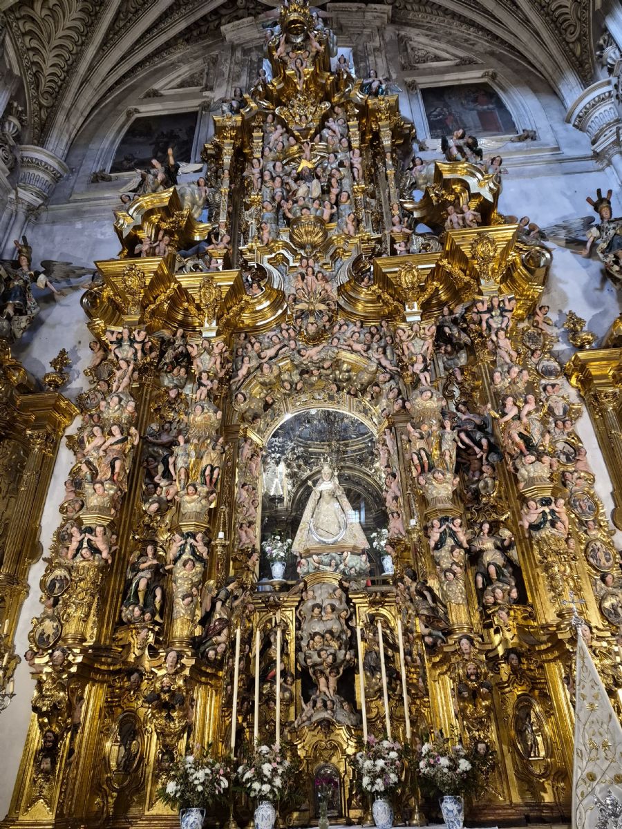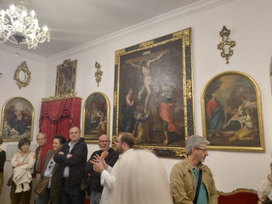 José Antonio Palma, nos explicó con detalle la simbología del conjunto, donde aparecen alegorías sobre la lucha entre la Gracia y el Pecado, la victoria espiritual y referencias a la Batalla de Lepanto, tan vinculada al rezo del Rosario. También nos habló de los relieves escultóricos y de la extraordinaria imagen de la Virgen del Rosario, talla del siglo XVI, revestida con ricas piezas de plata y piedras preciosas.
