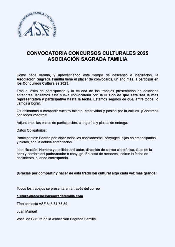 AGRADECIMIENTO A NUESTROS SOCIOS Y PARTICIPANTES La Asociación Sagrada Familia Cultura y Recreo ha vivido un año especialmente destacado gracias a la extraordinaria participación de sus socios y amigos en los Concursos Culturales 2025. Desde la Vocalía de Cultura se ha querido poner en valor el compromiso, la dedicación y el entusiasmo demostrados por todos los participantes, quienes han contribuido de manera decisiva al éxito de esta edición.La calidad de los trabajos...